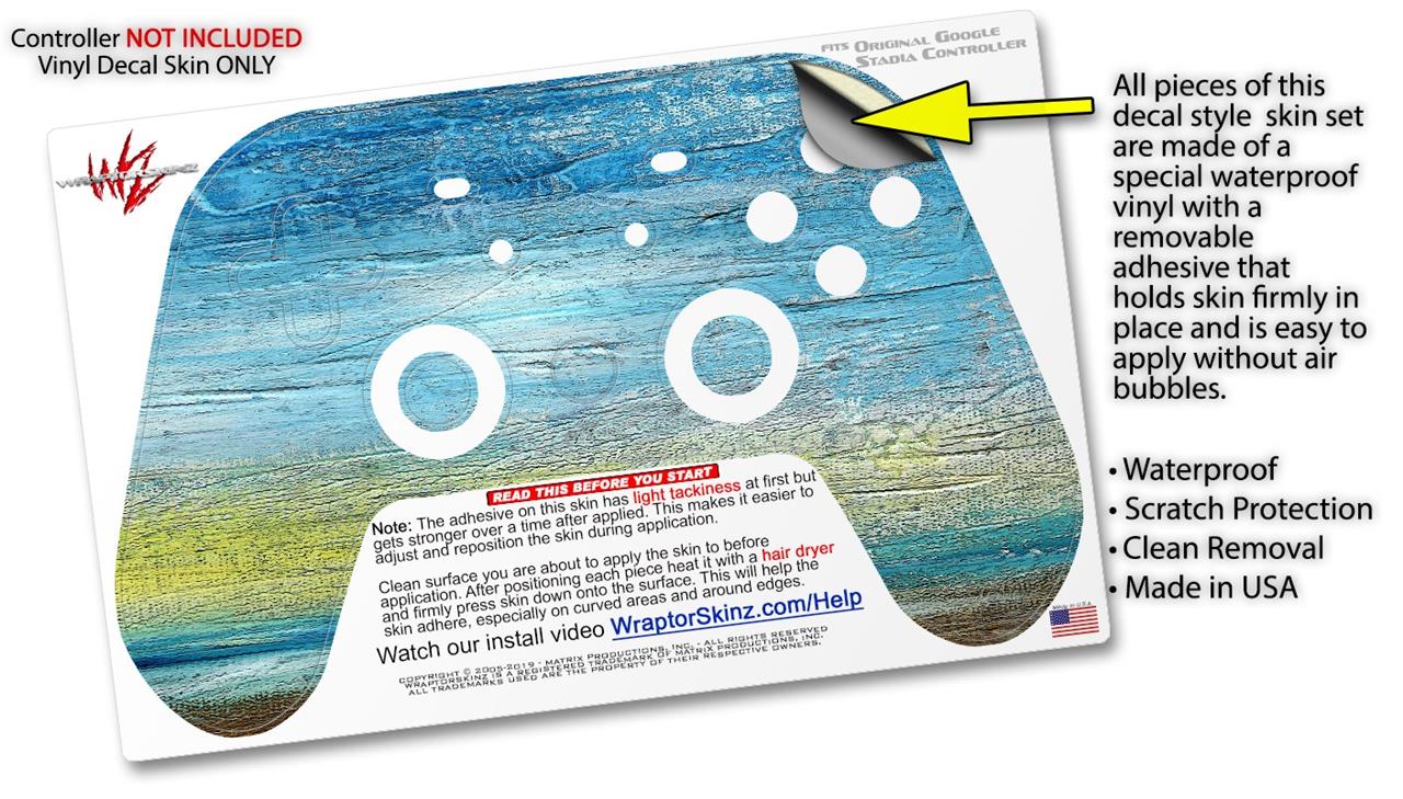 This product is in no way affiliated with or endorsed by Google. WraptorSkinz® skin wraps work with the Original Google Stadia version 1 Controller. Printed using superb photo quality designs and vibrant colors printed with special fade resistant inks that last even in direct sun for years. WraptorSkinz are a composite of two layers of commercial grade materials. The bottom layer is a soft, flexible vinyl with a special removable adhesive that is easily positioned, applied without air bubbles. Next, we print the bottom layer with UV protected, fade resistant inks that deliver superb photo quality designs in vibrant colors. Finally, we bond a professional grade laminate over the entire skin adding a glossy protective finish.