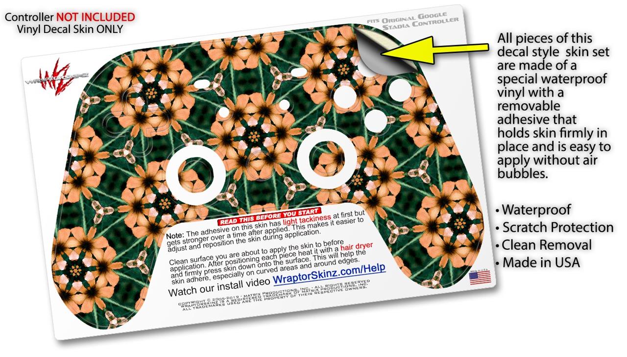 This product is in no way affiliated with or endorsed by Google. WraptorSkinz® skin wraps work with the Original Google Stadia version 1 Controller. Printed using superb photo quality designs and vibrant colors printed with special fade resistant inks that last even in direct sun for years. WraptorSkinz are a composite of two layers of commercial grade materials. The bottom layer is a soft, flexible vinyl with a special removable adhesive that is easily positioned, applied without air bubbles. Next, we print the bottom layer with UV protected, fade resistant inks that deliver superb photo quality designs in vibrant colors. Finally, we bond a professional grade laminate over the entire skin adding a glossy protective finish.