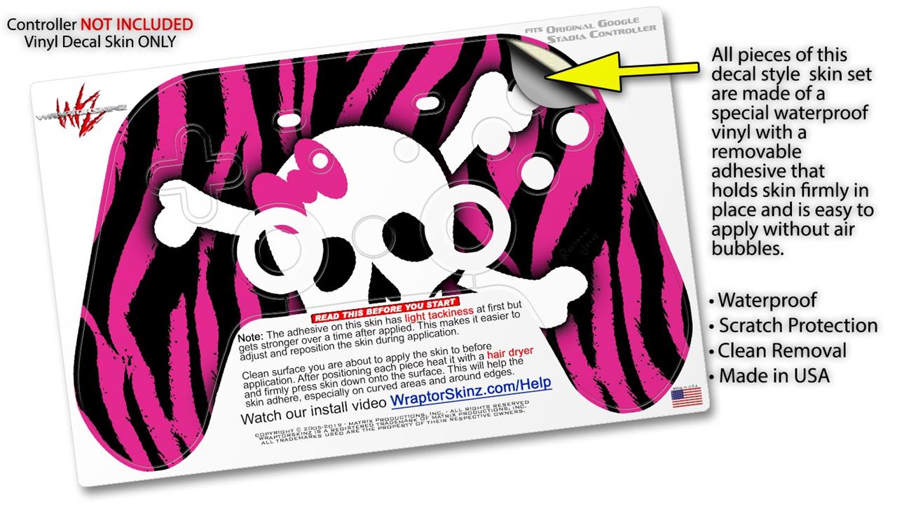 This product is in no way affiliated with or endorsed by Google. WraptorSkinz® skin wraps work with the Original Google Stadia version 1 Controller. Printed using superb photo quality designs and vibrant colors printed with special fade resistant inks that last even in direct sun for years. WraptorSkinz are a composite of two layers of commercial grade materials. The bottom layer is a soft, flexible vinyl with a special removable adhesive that is easily positioned, applied without air bubbles. Next, we print the bottom layer with UV protected, fade resistant inks that deliver superb photo quality designs in vibrant colors. Finally, we bond a professional grade laminate over the entire skin adding a glossy protective finish.
