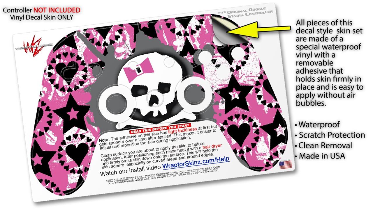 This product is in no way affiliated with or endorsed by Google. WraptorSkinz® skin wraps work with the Original Google Stadia version 1 Controller. Printed using superb photo quality designs and vibrant colors printed with special fade resistant inks that last even in direct sun for years. WraptorSkinz are a composite of two layers of commercial grade materials. The bottom layer is a soft, flexible vinyl with a special removable adhesive that is easily positioned, applied without air bubbles. Next, we print the bottom layer with UV protected, fade resistant inks that deliver superb photo quality designs in vibrant colors. Finally, we bond a professional grade laminate over the entire skin adding a glossy protective finish.