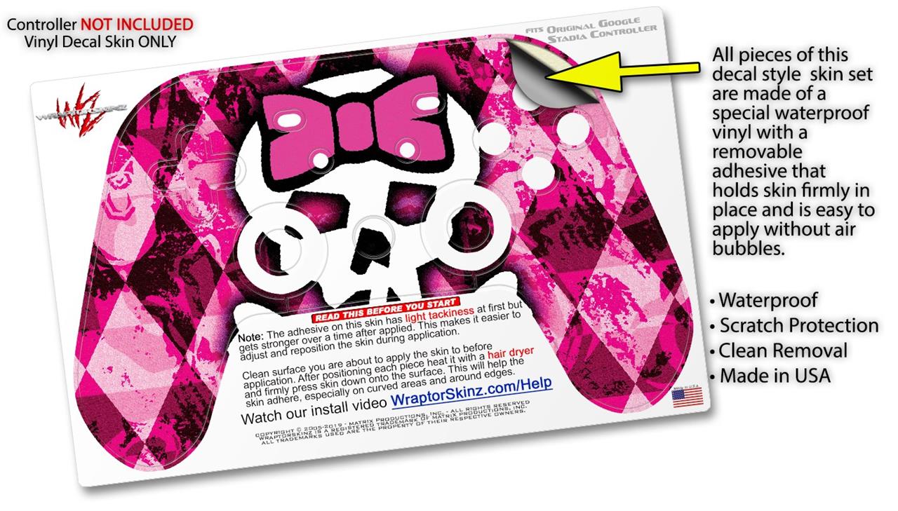 This product is in no way affiliated with or endorsed by Google. WraptorSkinz® skin wraps work with the Original Google Stadia version 1 Controller. Printed using superb photo quality designs and vibrant colors printed with special fade resistant inks that last even in direct sun for years. WraptorSkinz are a composite of two layers of commercial grade materials. The bottom layer is a soft, flexible vinyl with a special removable adhesive that is easily positioned, applied without air bubbles. Next, we print the bottom layer with UV protected, fade resistant inks that deliver superb photo quality designs in vibrant colors. Finally, we bond a professional grade laminate over the entire skin adding a glossy protective finish.