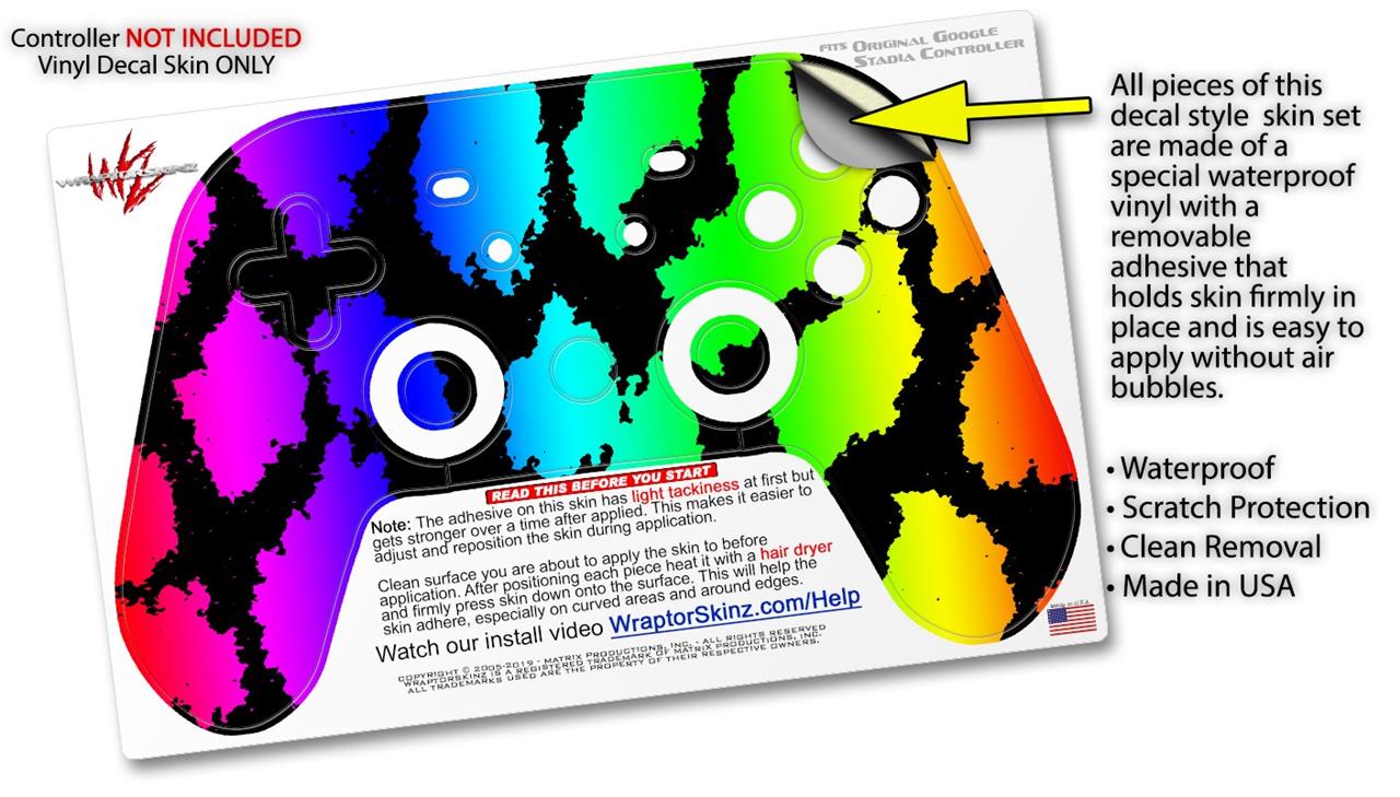 This product is in no way affiliated with or endorsed by Google. WraptorSkinz® skin wraps work with the Original Google Stadia version 1 Controller. Printed using superb photo quality designs and vibrant colors printed with special fade resistant inks that last even in direct sun for years. WraptorSkinz are a composite of two layers of commercial grade materials. The bottom layer is a soft, flexible vinyl with a special removable adhesive that is easily positioned, applied without air bubbles. Next, we print the bottom layer with UV protected, fade resistant inks that deliver superb photo quality designs in vibrant colors. Finally, we bond a professional grade laminate over the entire skin adding a glossy protective finish.
