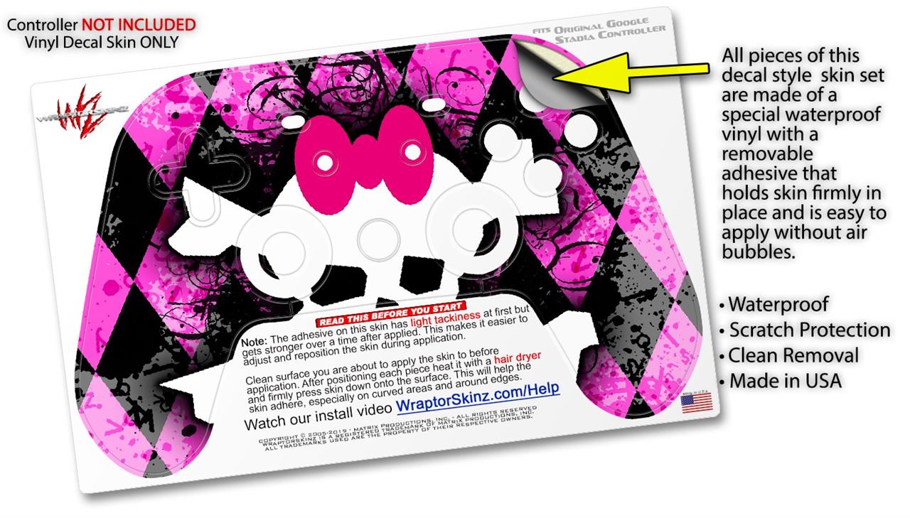 This product is in no way affiliated with or endorsed by Google. WraptorSkinz® skin wraps work with the Original Google Stadia version 1 Controller. Printed using superb photo quality designs and vibrant colors printed with special fade resistant inks that last even in direct sun for years. WraptorSkinz are a composite of two layers of commercial grade materials. The bottom layer is a soft, flexible vinyl with a special removable adhesive that is easily positioned, applied without air bubbles. Next, we print the bottom layer with UV protected, fade resistant inks that deliver superb photo quality designs in vibrant colors. Finally, we bond a professional grade laminate over the entire skin adding a glossy protective finish.