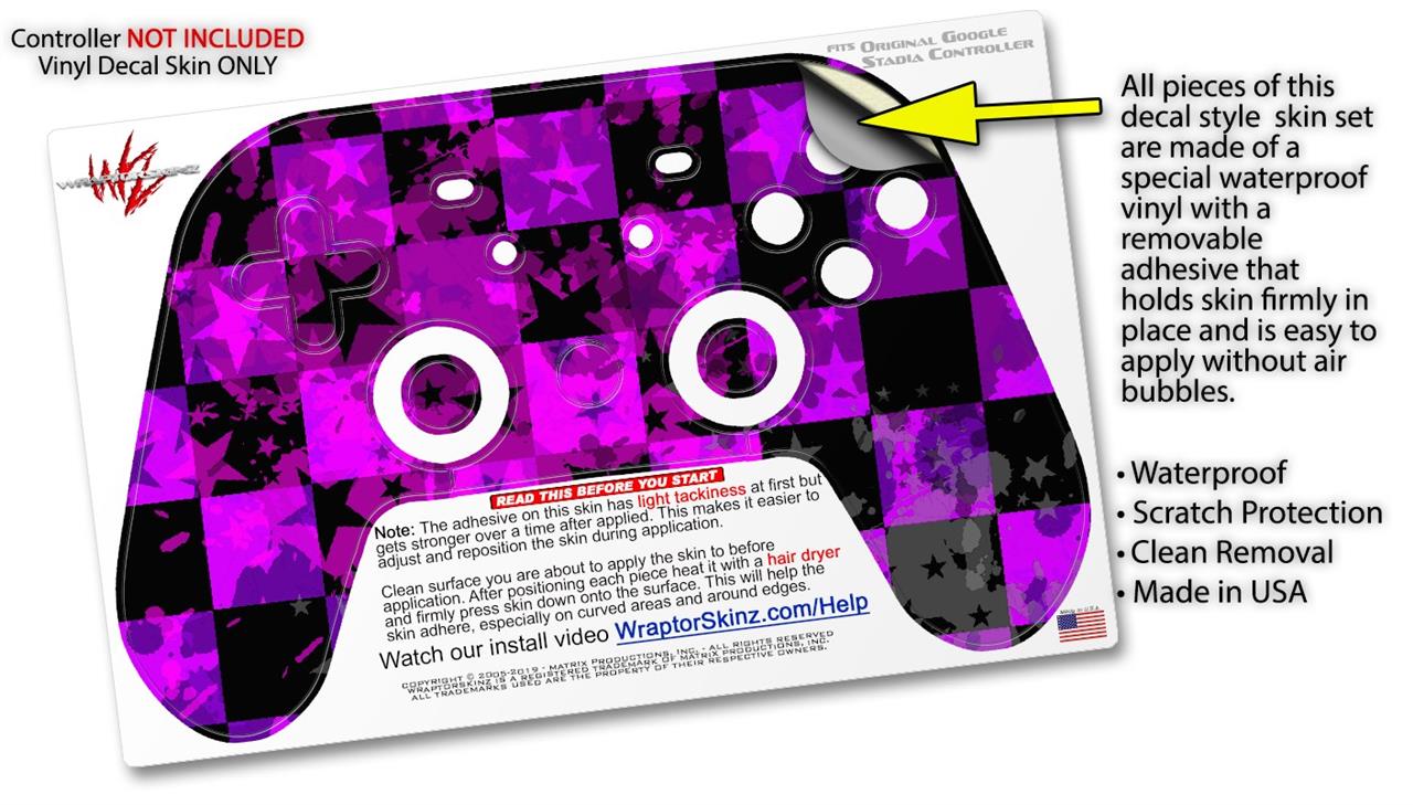 This product is in no way affiliated with or endorsed by Google. WraptorSkinz® skin wraps work with the Original Google Stadia version 1 Controller. Printed using superb photo quality designs and vibrant colors printed with special fade resistant inks that last even in direct sun for years. WraptorSkinz are a composite of two layers of commercial grade materials. The bottom layer is a soft, flexible vinyl with a special removable adhesive that is easily positioned, applied without air bubbles. Next, we print the bottom layer with UV protected, fade resistant inks that deliver superb photo quality designs in vibrant colors. Finally, we bond a professional grade laminate over the entire skin adding a glossy protective finish.