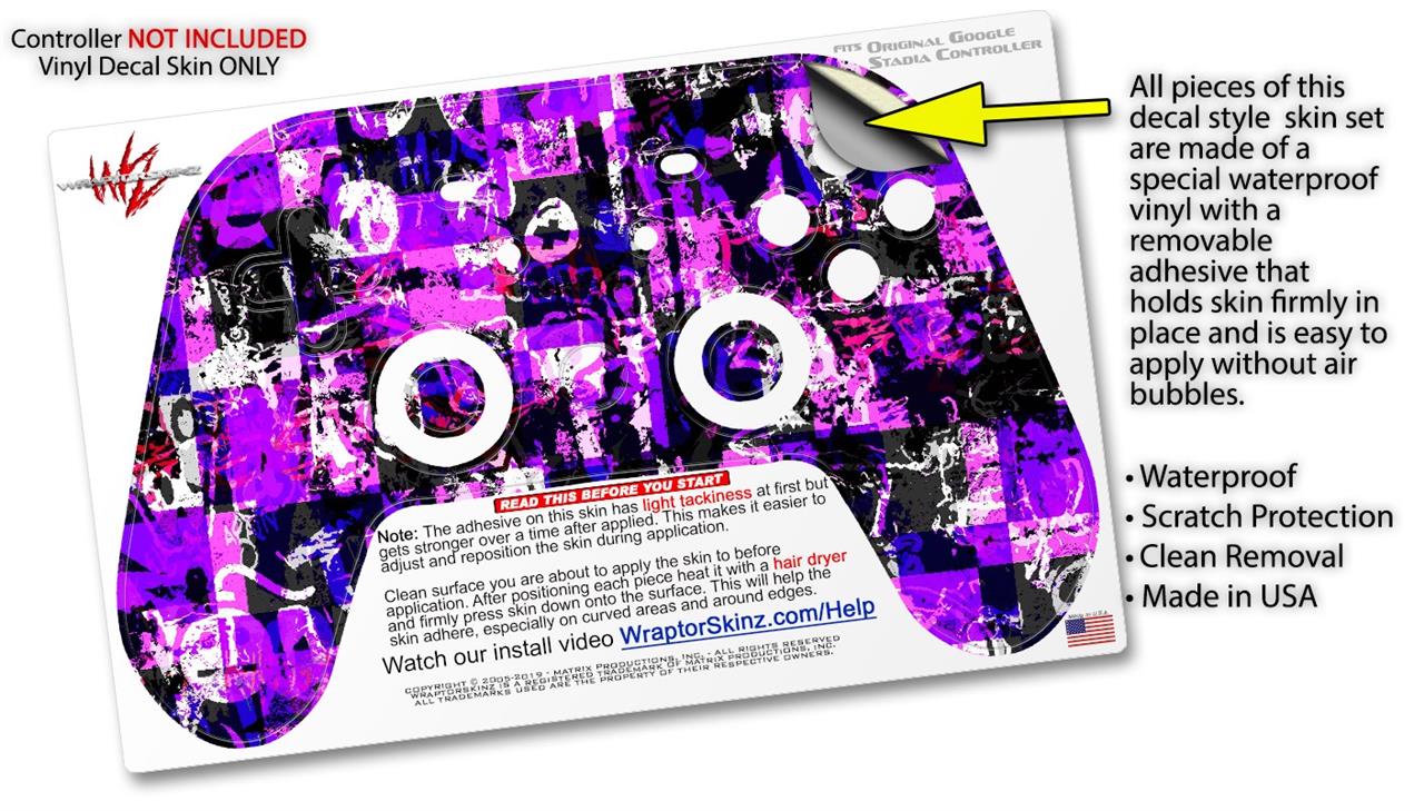 This product is in no way affiliated with or endorsed by Google. WraptorSkinz® skin wraps work with the Original Google Stadia version 1 Controller. Printed using superb photo quality designs and vibrant colors printed with special fade resistant inks that last even in direct sun for years. WraptorSkinz are a composite of two layers of commercial grade materials. The bottom layer is a soft, flexible vinyl with a special removable adhesive that is easily positioned, applied without air bubbles. Next, we print the bottom layer with UV protected, fade resistant inks that deliver superb photo quality designs in vibrant colors. Finally, we bond a professional grade laminate over the entire skin adding a glossy protective finish.