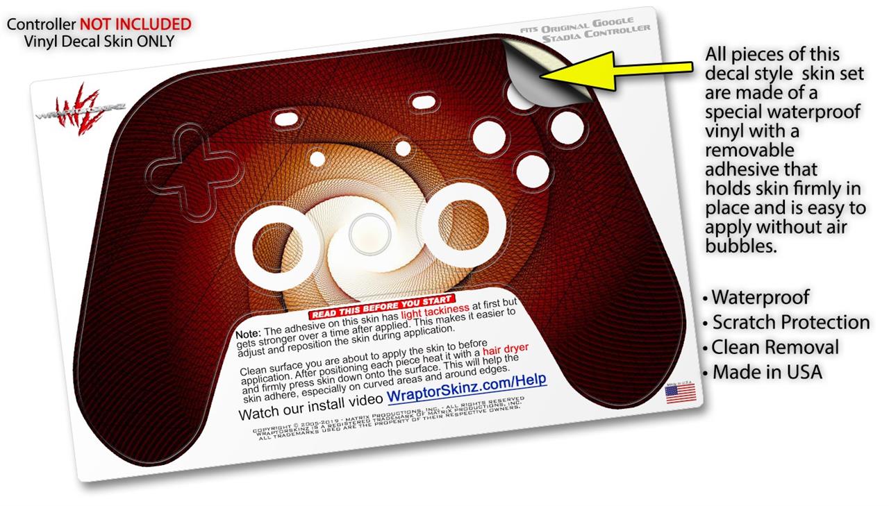 This product is in no way affiliated with or endorsed by Google. WraptorSkinz® skin wraps work with the Original Google Stadia version 1 Controller. Printed using superb photo quality designs and vibrant colors printed with special fade resistant inks that last even in direct sun for years. WraptorSkinz are a composite of two layers of commercial grade materials. The bottom layer is a soft, flexible vinyl with a special removable adhesive that is easily positioned, applied without air bubbles. Next, we print the bottom layer with UV protected, fade resistant inks that deliver superb photo quality designs in vibrant colors. Finally, we bond a professional grade laminate over the entire skin adding a glossy protective finish.