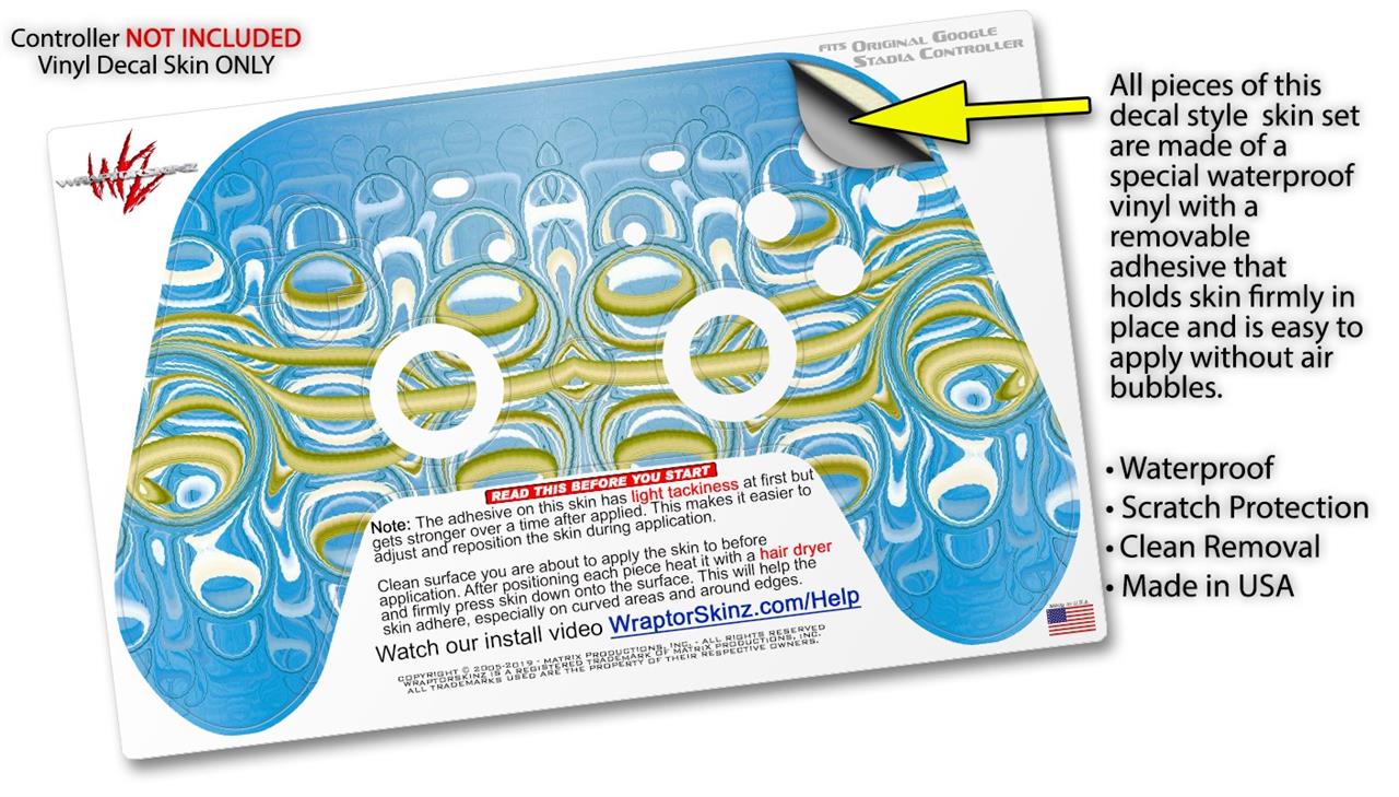 This product is in no way affiliated with or endorsed by Google. WraptorSkinz® skin wraps work with the Original Google Stadia version 1 Controller. Printed using superb photo quality designs and vibrant colors printed with special fade resistant inks that last even in direct sun for years. WraptorSkinz are a composite of two layers of commercial grade materials. The bottom layer is a soft, flexible vinyl with a special removable adhesive that is easily positioned, applied without air bubbles. Next, we print the bottom layer with UV protected, fade resistant inks that deliver superb photo quality designs in vibrant colors. Finally, we bond a professional grade laminate over the entire skin adding a glossy protective finish.