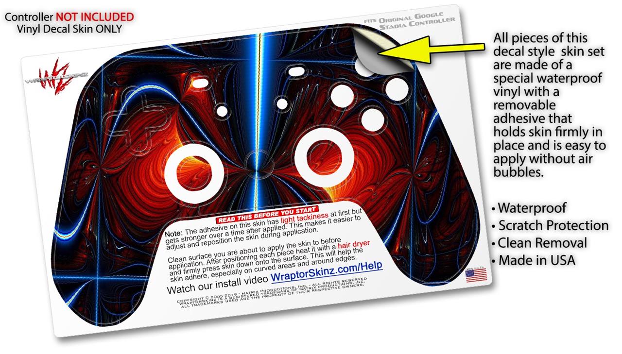 This product is in no way affiliated with or endorsed by Google. WraptorSkinz® skin wraps work with the Original Google Stadia version 1 Controller. Printed using superb photo quality designs and vibrant colors printed with special fade resistant inks that last even in direct sun for years. WraptorSkinz are a composite of two layers of commercial grade materials. The bottom layer is a soft, flexible vinyl with a special removable adhesive that is easily positioned, applied without air bubbles. Next, we print the bottom layer with UV protected, fade resistant inks that deliver superb photo quality designs in vibrant colors. Finally, we bond a professional grade laminate over the entire skin adding a glossy protective finish.