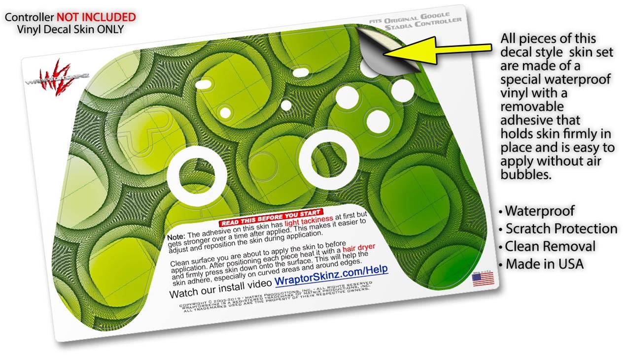This product is in no way affiliated with or endorsed by Google. WraptorSkinz® skin wraps work with the Original Google Stadia version 1 Controller. Printed using superb photo quality designs and vibrant colors printed with special fade resistant inks that last even in direct sun for years. WraptorSkinz are a composite of two layers of commercial grade materials. The bottom layer is a soft, flexible vinyl with a special removable adhesive that is easily positioned, applied without air bubbles. Next, we print the bottom layer with UV protected, fade resistant inks that deliver superb photo quality designs in vibrant colors. Finally, we bond a professional grade laminate over the entire skin adding a glossy protective finish.