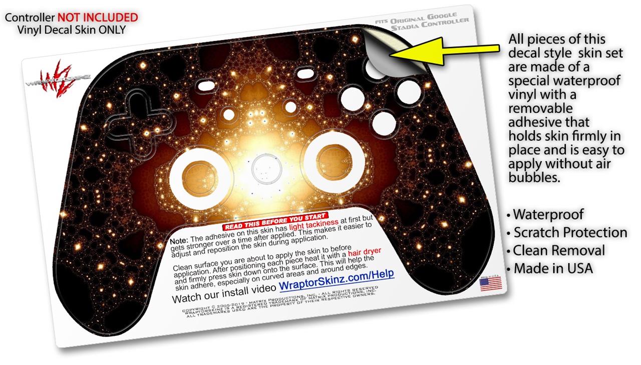 This product is in no way affiliated with or endorsed by Google. WraptorSkinz® skin wraps work with the Original Google Stadia version 1 Controller. Printed using superb photo quality designs and vibrant colors printed with special fade resistant inks that last even in direct sun for years. WraptorSkinz are a composite of two layers of commercial grade materials. The bottom layer is a soft, flexible vinyl with a special removable adhesive that is easily positioned, applied without air bubbles. Next, we print the bottom layer with UV protected, fade resistant inks that deliver superb photo quality designs in vibrant colors. Finally, we bond a professional grade laminate over the entire skin adding a glossy protective finish.