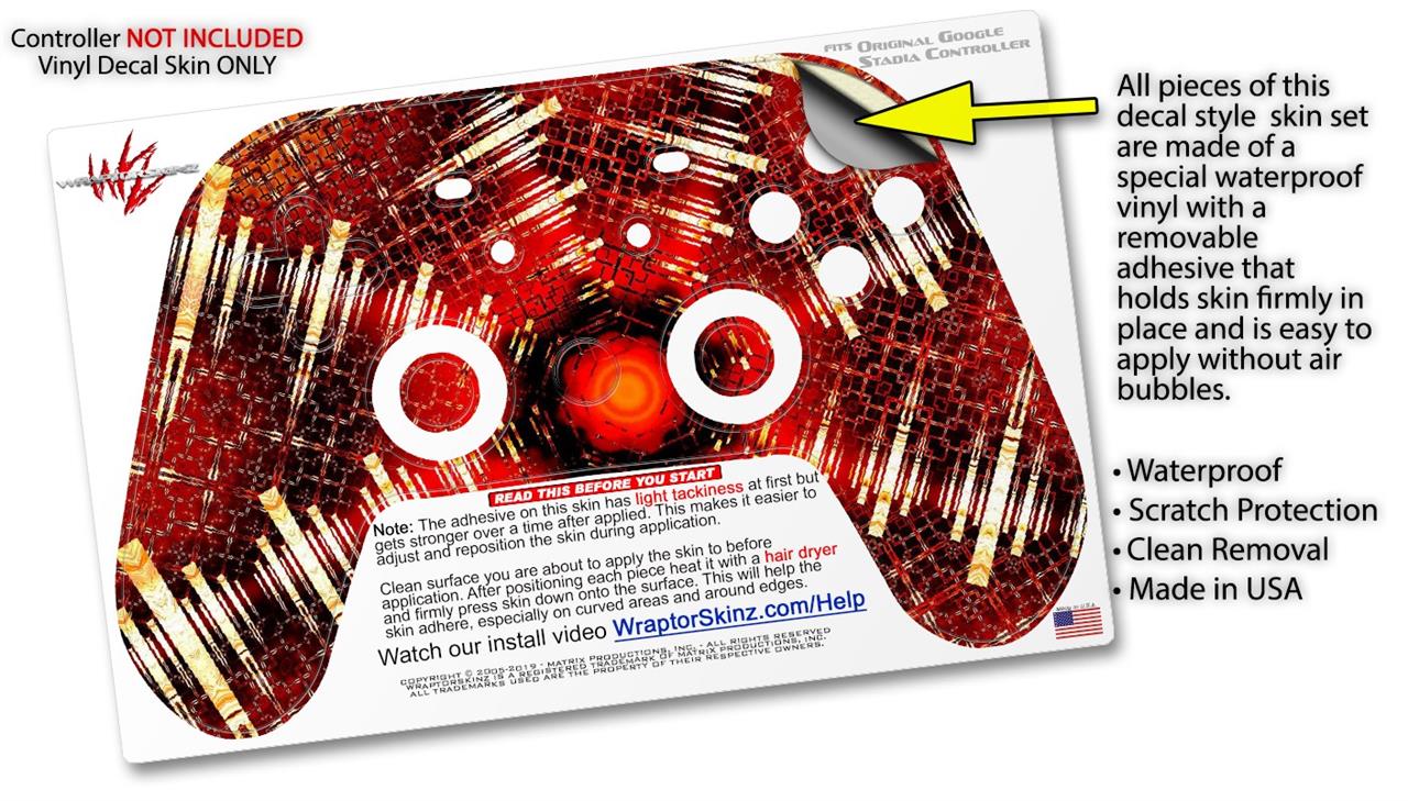 This product is in no way affiliated with or endorsed by Google. WraptorSkinz® skin wraps work with the Original Google Stadia version 1 Controller. Printed using superb photo quality designs and vibrant colors printed with special fade resistant inks that last even in direct sun for years. WraptorSkinz are a composite of two layers of commercial grade materials. The bottom layer is a soft, flexible vinyl with a special removable adhesive that is easily positioned, applied without air bubbles. Next, we print the bottom layer with UV protected, fade resistant inks that deliver superb photo quality designs in vibrant colors. Finally, we bond a professional grade laminate over the entire skin adding a glossy protective finish.