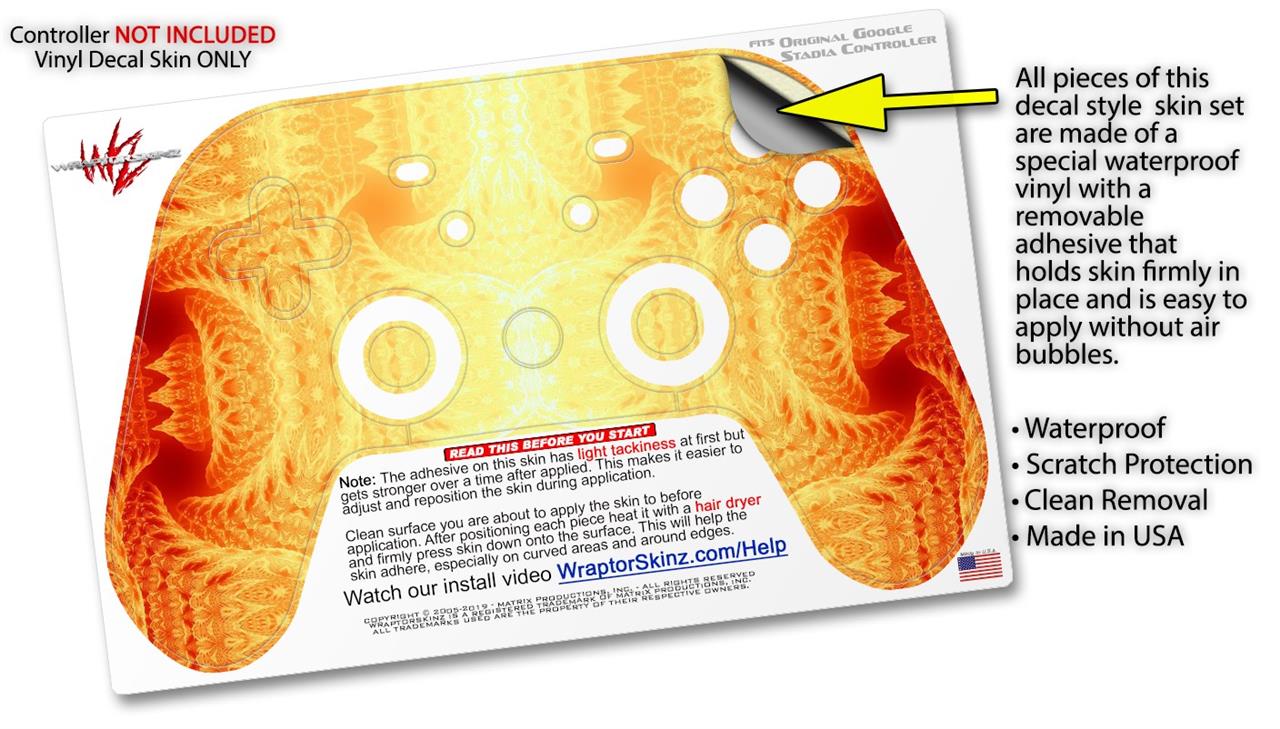 This product is in no way affiliated with or endorsed by Google. WraptorSkinz® skin wraps work with the Original Google Stadia version 1 Controller. Printed using superb photo quality designs and vibrant colors printed with special fade resistant inks that last even in direct sun for years. WraptorSkinz are a composite of two layers of commercial grade materials. The bottom layer is a soft, flexible vinyl with a special removable adhesive that is easily positioned, applied without air bubbles. Next, we print the bottom layer with UV protected, fade resistant inks that deliver superb photo quality designs in vibrant colors. Finally, we bond a professional grade laminate over the entire skin adding a glossy protective finish.