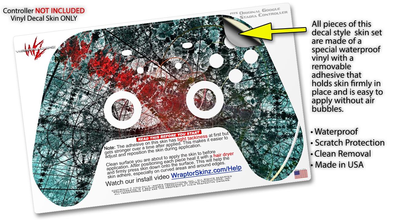 This product is in no way affiliated with or endorsed by Google. WraptorSkinz® skin wraps work with the Original Google Stadia version 1 Controller. Printed using superb photo quality designs and vibrant colors printed with special fade resistant inks that last even in direct sun for years. WraptorSkinz are a composite of two layers of commercial grade materials. The bottom layer is a soft, flexible vinyl with a special removable adhesive that is easily positioned, applied without air bubbles. Next, we print the bottom layer with UV protected, fade resistant inks that deliver superb photo quality designs in vibrant colors. Finally, we bond a professional grade laminate over the entire skin adding a glossy protective finish.