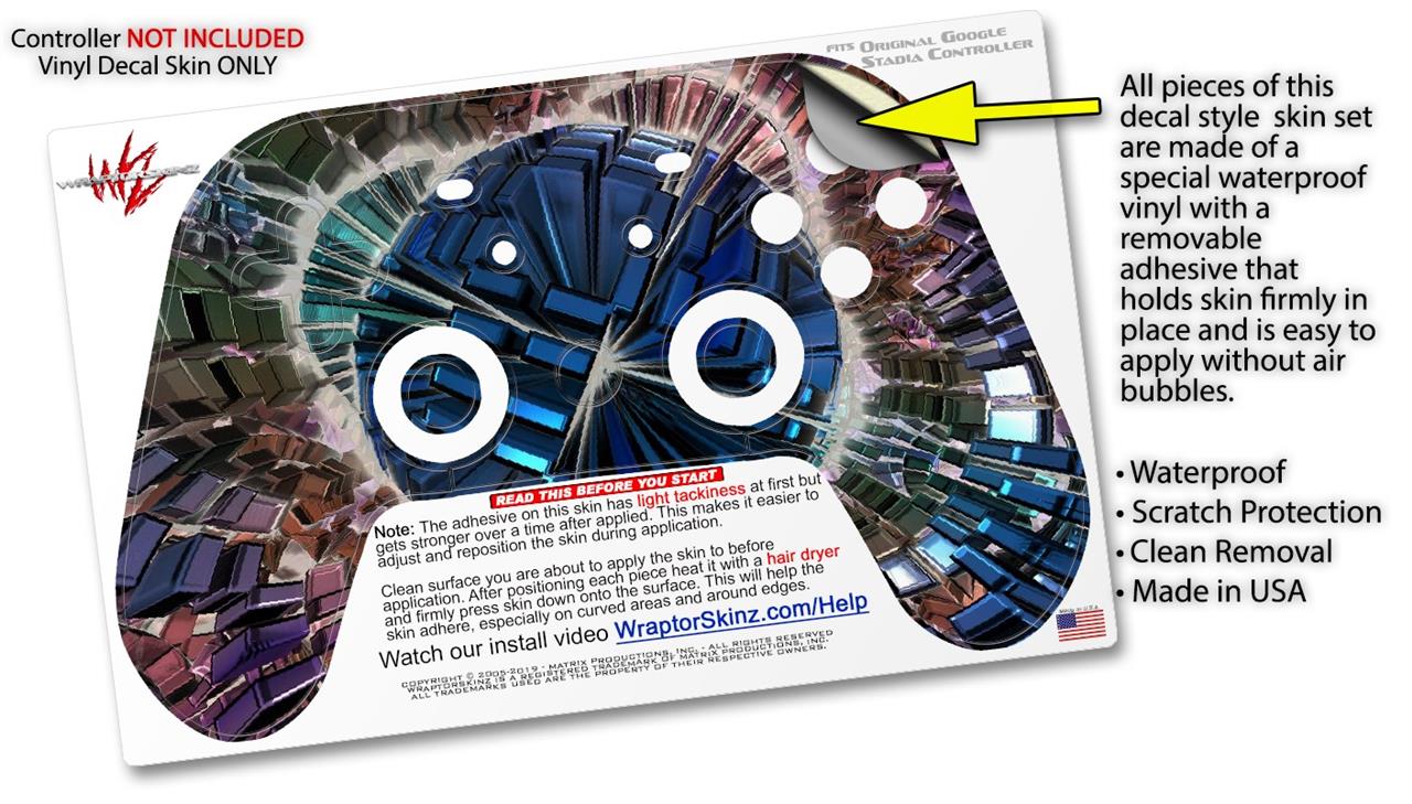 This product is in no way affiliated with or endorsed by Google. WraptorSkinz® skin wraps work with the Original Google Stadia version 1 Controller. Printed using superb photo quality designs and vibrant colors printed with special fade resistant inks that last even in direct sun for years. WraptorSkinz are a composite of two layers of commercial grade materials. The bottom layer is a soft, flexible vinyl with a special removable adhesive that is easily positioned, applied without air bubbles. Next, we print the bottom layer with UV protected, fade resistant inks that deliver superb photo quality designs in vibrant colors. Finally, we bond a professional grade laminate over the entire skin adding a glossy protective finish.