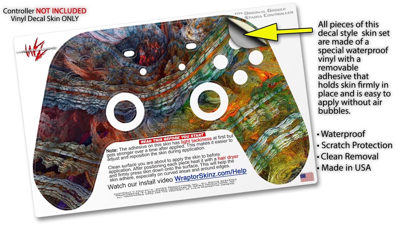 This product is in no way affiliated with or endorsed by Google. WraptorSkinz® skin wraps work with the Original Google Stadia version 1 Controller. Printed using superb photo quality designs and vibrant colors printed with special fade resistant inks that last even in direct sun for years. WraptorSkinz are a composite of two layers of commercial grade materials. The bottom layer is a soft, flexible vinyl with a special removable adhesive that is easily positioned, applied without air bubbles. Next, we print the bottom layer with UV protected, fade resistant inks that deliver superb photo quality designs in vibrant colors. Finally, we bond a professional grade laminate over the entire skin adding a glossy protective finish.