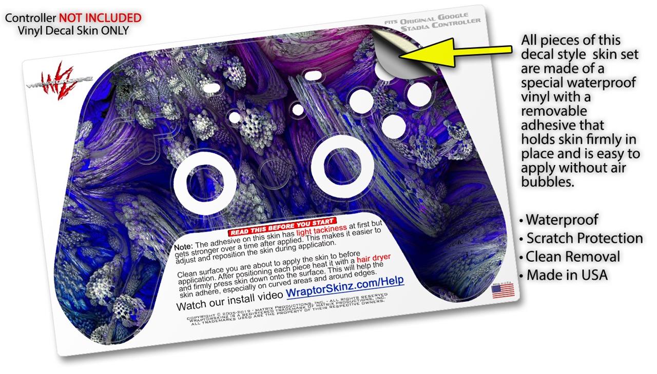 This product is in no way affiliated with or endorsed by Google. WraptorSkinz® skin wraps work with the Original Google Stadia version 1 Controller. Printed using superb photo quality designs and vibrant colors printed with special fade resistant inks that last even in direct sun for years. WraptorSkinz are a composite of two layers of commercial grade materials. The bottom layer is a soft, flexible vinyl with a special removable adhesive that is easily positioned, applied without air bubbles. Next, we print the bottom layer with UV protected, fade resistant inks that deliver superb photo quality designs in vibrant colors. Finally, we bond a professional grade laminate over the entire skin adding a glossy protective finish.