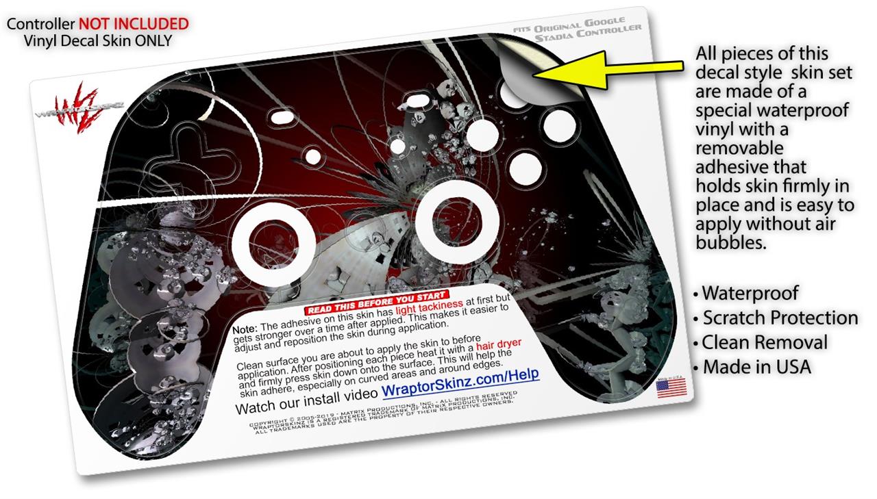 This product is in no way affiliated with or endorsed by Google. WraptorSkinz® skin wraps work with the Original Google Stadia version 1 Controller. Printed using superb photo quality designs and vibrant colors printed with special fade resistant inks that last even in direct sun for years. WraptorSkinz are a composite of two layers of commercial grade materials. The bottom layer is a soft, flexible vinyl with a special removable adhesive that is easily positioned, applied without air bubbles. Next, we print the bottom layer with UV protected, fade resistant inks that deliver superb photo quality designs in vibrant colors. Finally, we bond a professional grade laminate over the entire skin adding a glossy protective finish.