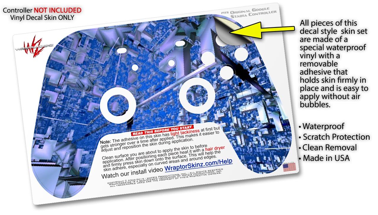 This product is in no way affiliated with or endorsed by Google. WraptorSkinz® skin wraps work with the Original Google Stadia version 1 Controller. Printed using superb photo quality designs and vibrant colors printed with special fade resistant inks that last even in direct sun for years. WraptorSkinz are a composite of two layers of commercial grade materials. The bottom layer is a soft, flexible vinyl with a special removable adhesive that is easily positioned, applied without air bubbles. Next, we print the bottom layer with UV protected, fade resistant inks that deliver superb photo quality designs in vibrant colors. Finally, we bond a professional grade laminate over the entire skin adding a glossy protective finish.