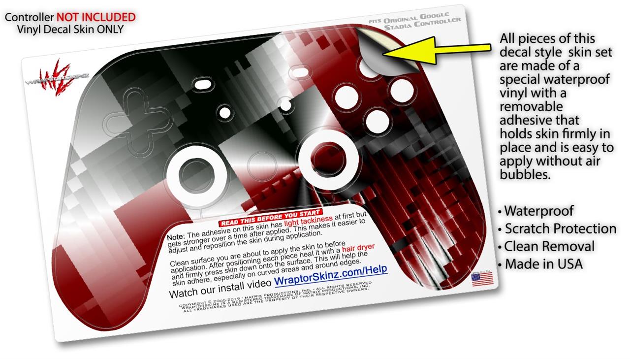 This product is in no way affiliated with or endorsed by Google. WraptorSkinz® skin wraps work with the Original Google Stadia version 1 Controller. Printed using superb photo quality designs and vibrant colors printed with special fade resistant inks that last even in direct sun for years. WraptorSkinz are a composite of two layers of commercial grade materials. The bottom layer is a soft, flexible vinyl with a special removable adhesive that is easily positioned, applied without air bubbles. Next, we print the bottom layer with UV protected, fade resistant inks that deliver superb photo quality designs in vibrant colors. Finally, we bond a professional grade laminate over the entire skin adding a glossy protective finish.