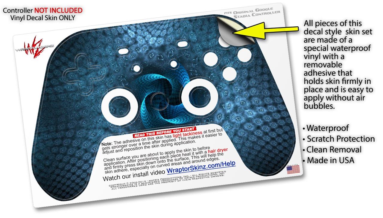 This product is in no way affiliated with or endorsed by Google. WraptorSkinz® skin wraps work with the Original Google Stadia version 1 Controller. Printed using superb photo quality designs and vibrant colors printed with special fade resistant inks that last even in direct sun for years. WraptorSkinz are a composite of two layers of commercial grade materials. The bottom layer is a soft, flexible vinyl with a special removable adhesive that is easily positioned, applied without air bubbles. Next, we print the bottom layer with UV protected, fade resistant inks that deliver superb photo quality designs in vibrant colors. Finally, we bond a professional grade laminate over the entire skin adding a glossy protective finish.