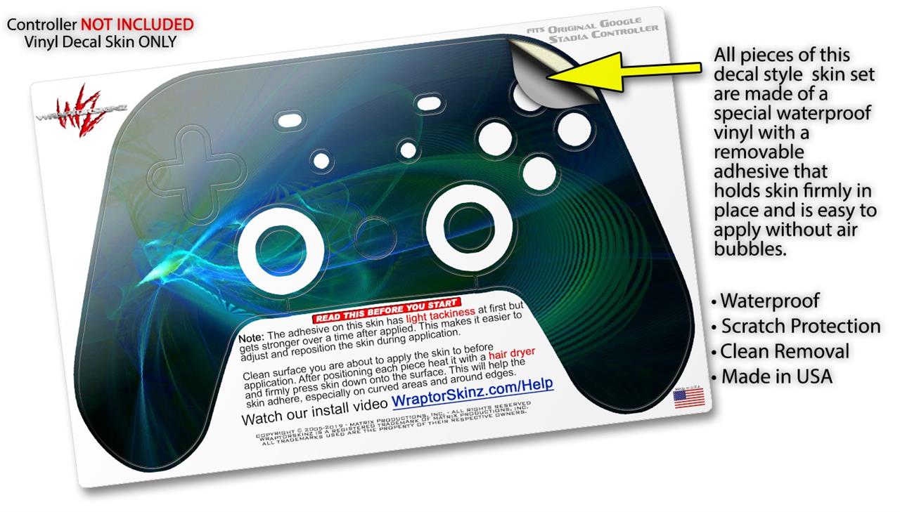 This product is in no way affiliated with or endorsed by Google. WraptorSkinz® skin wraps work with the Original Google Stadia version 1 Controller. Printed using superb photo quality designs and vibrant colors printed with special fade resistant inks that last even in direct sun for years. WraptorSkinz are a composite of two layers of commercial grade materials. The bottom layer is a soft, flexible vinyl with a special removable adhesive that is easily positioned, applied without air bubbles. Next, we print the bottom layer with UV protected, fade resistant inks that deliver superb photo quality designs in vibrant colors. Finally, we bond a professional grade laminate over the entire skin adding a glossy protective finish.
