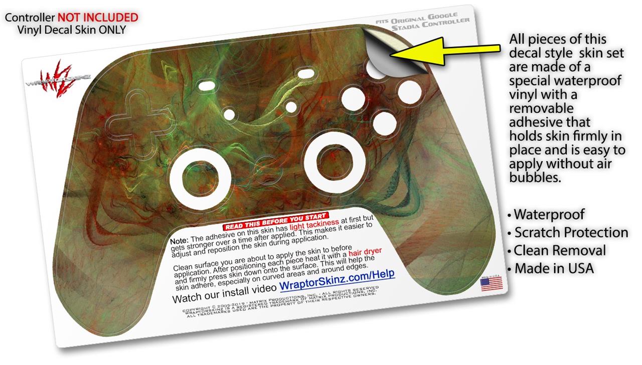 This product is in no way affiliated with or endorsed by Google. WraptorSkinz® skin wraps work with the Original Google Stadia version 1 Controller. Printed using superb photo quality designs and vibrant colors printed with special fade resistant inks that last even in direct sun for years. WraptorSkinz are a composite of two layers of commercial grade materials. The bottom layer is a soft, flexible vinyl with a special removable adhesive that is easily positioned, applied without air bubbles. Next, we print the bottom layer with UV protected, fade resistant inks that deliver superb photo quality designs in vibrant colors. Finally, we bond a professional grade laminate over the entire skin adding a glossy protective finish.