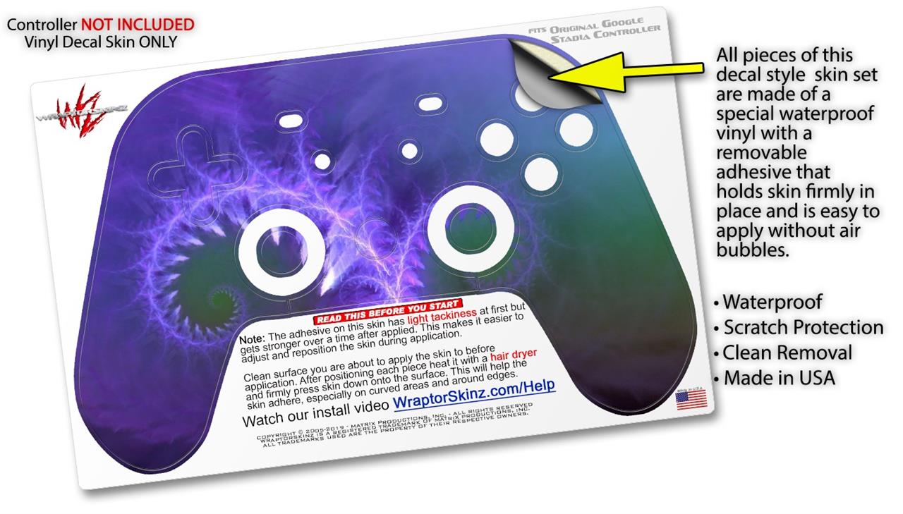 This product is in no way affiliated with or endorsed by Google. WraptorSkinz® skin wraps work with the Original Google Stadia version 1 Controller. Printed using superb photo quality designs and vibrant colors printed with special fade resistant inks that last even in direct sun for years. WraptorSkinz are a composite of two layers of commercial grade materials. The bottom layer is a soft, flexible vinyl with a special removable adhesive that is easily positioned, applied without air bubbles. Next, we print the bottom layer with UV protected, fade resistant inks that deliver superb photo quality designs in vibrant colors. Finally, we bond a professional grade laminate over the entire skin adding a glossy protective finish.