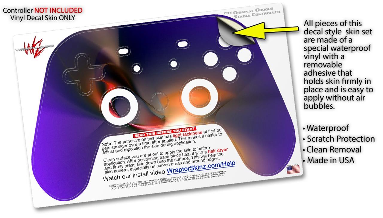 This product is in no way affiliated with or endorsed by Google. WraptorSkinz® skin wraps work with the Original Google Stadia version 1 Controller. Printed using superb photo quality designs and vibrant colors printed with special fade resistant inks that last even in direct sun for years. WraptorSkinz are a composite of two layers of commercial grade materials. The bottom layer is a soft, flexible vinyl with a special removable adhesive that is easily positioned, applied without air bubbles. Next, we print the bottom layer with UV protected, fade resistant inks that deliver superb photo quality designs in vibrant colors. Finally, we bond a professional grade laminate over the entire skin adding a glossy protective finish.
