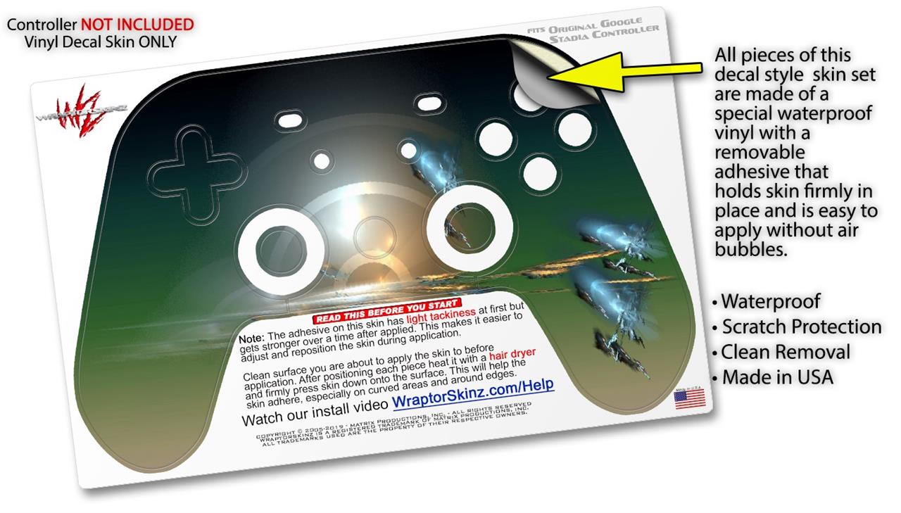 This product is in no way affiliated with or endorsed by Google. WraptorSkinz® skin wraps work with the Original Google Stadia version 1 Controller. Printed using superb photo quality designs and vibrant colors printed with special fade resistant inks that last even in direct sun for years. WraptorSkinz are a composite of two layers of commercial grade materials. The bottom layer is a soft, flexible vinyl with a special removable adhesive that is easily positioned, applied without air bubbles. Next, we print the bottom layer with UV protected, fade resistant inks that deliver superb photo quality designs in vibrant colors. Finally, we bond a professional grade laminate over the entire skin adding a glossy protective finish.