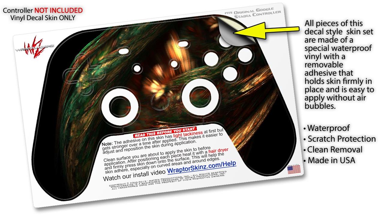 This product is in no way affiliated with or endorsed by Google. WraptorSkinz® skin wraps work with the Original Google Stadia version 1 Controller. Printed using superb photo quality designs and vibrant colors printed with special fade resistant inks that last even in direct sun for years. WraptorSkinz are a composite of two layers of commercial grade materials. The bottom layer is a soft, flexible vinyl with a special removable adhesive that is easily positioned, applied without air bubbles. Next, we print the bottom layer with UV protected, fade resistant inks that deliver superb photo quality designs in vibrant colors. Finally, we bond a professional grade laminate over the entire skin adding a glossy protective finish.