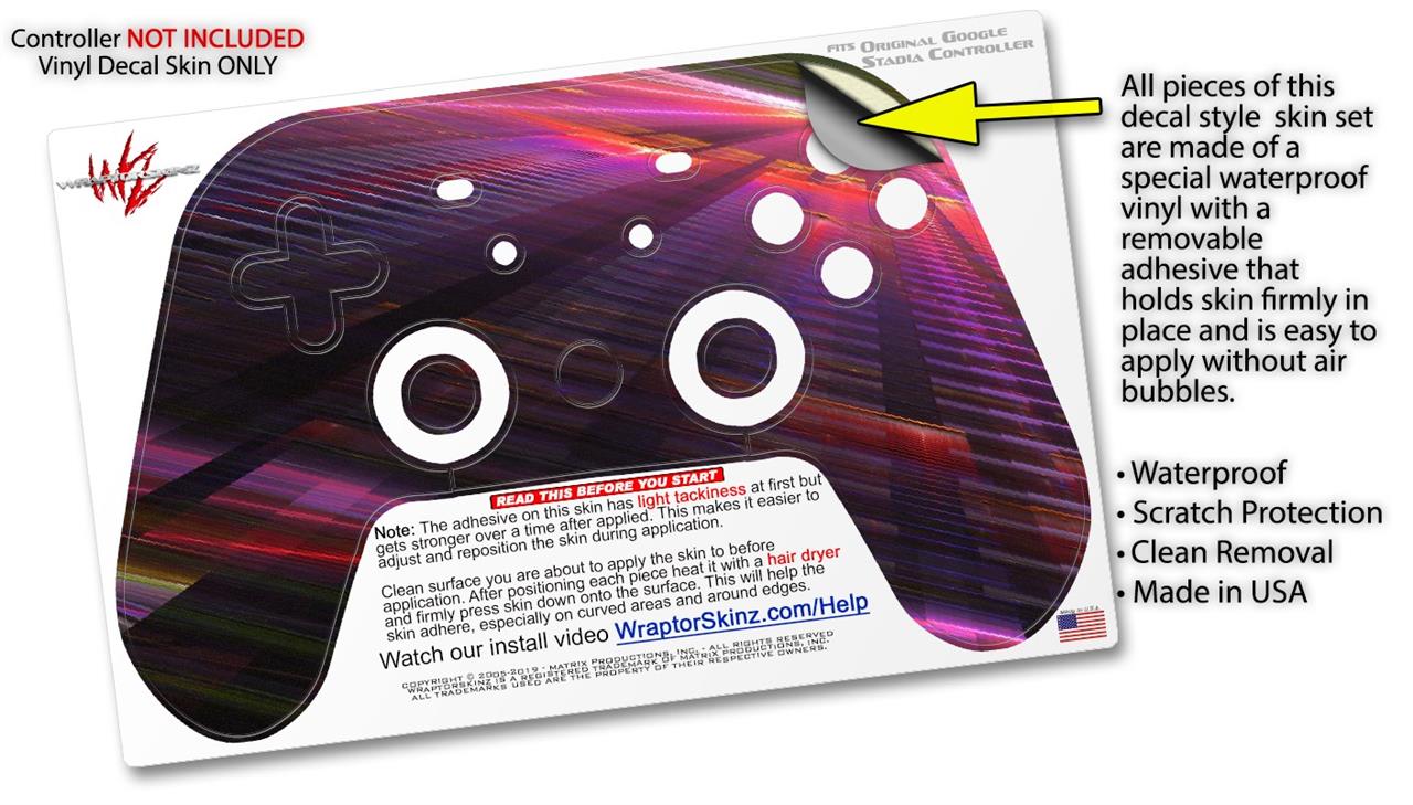 This product is in no way affiliated with or endorsed by Google. WraptorSkinz® skin wraps work with the Original Google Stadia version 1 Controller. Printed using superb photo quality designs and vibrant colors printed with special fade resistant inks that last even in direct sun for years. WraptorSkinz are a composite of two layers of commercial grade materials. The bottom layer is a soft, flexible vinyl with a special removable adhesive that is easily positioned, applied without air bubbles. Next, we print the bottom layer with UV protected, fade resistant inks that deliver superb photo quality designs in vibrant colors. Finally, we bond a professional grade laminate over the entire skin adding a glossy protective finish.
