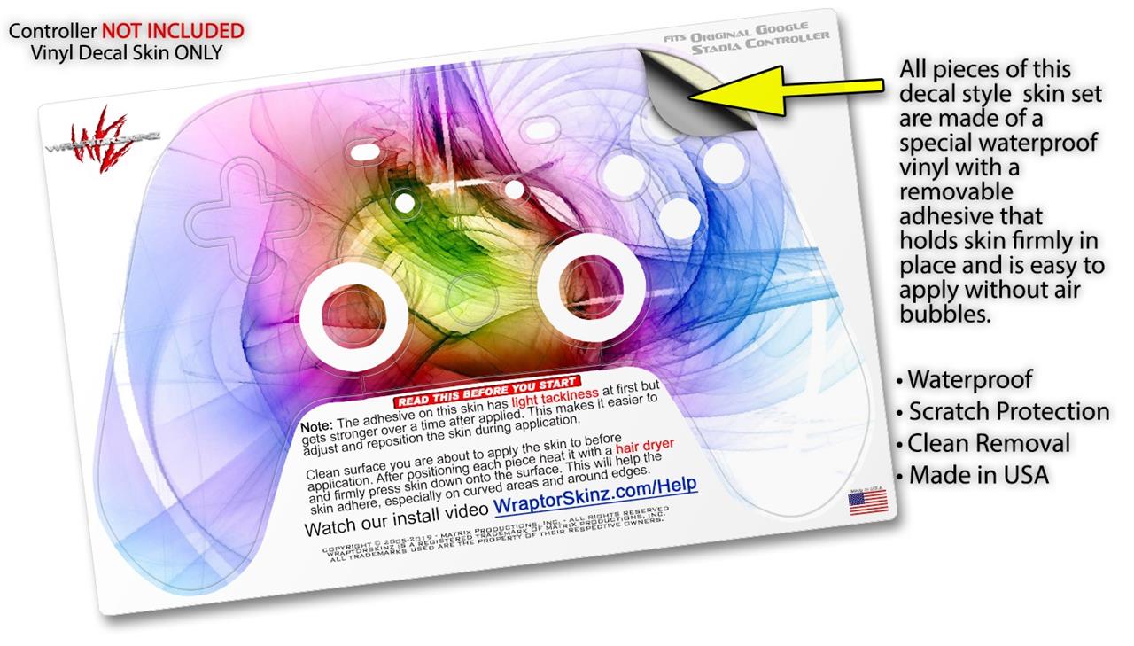 This product is in no way affiliated with or endorsed by Google. WraptorSkinz® skin wraps work with the Original Google Stadia version 1 Controller. Printed using superb photo quality designs and vibrant colors printed with special fade resistant inks that last even in direct sun for years. WraptorSkinz are a composite of two layers of commercial grade materials. The bottom layer is a soft, flexible vinyl with a special removable adhesive that is easily positioned, applied without air bubbles. Next, we print the bottom layer with UV protected, fade resistant inks that deliver superb photo quality designs in vibrant colors. Finally, we bond a professional grade laminate over the entire skin adding a glossy protective finish.