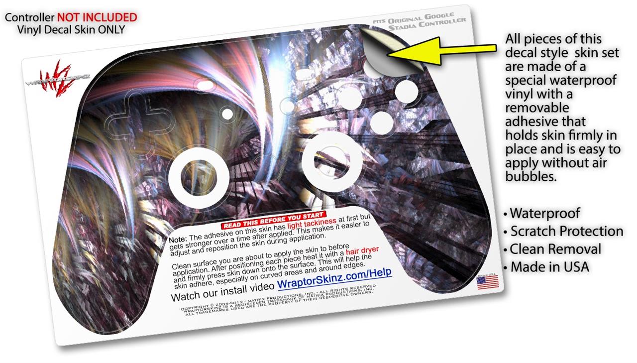 This product is in no way affiliated with or endorsed by Google. WraptorSkinz® skin wraps work with the Original Google Stadia version 1 Controller. Printed using superb photo quality designs and vibrant colors printed with special fade resistant inks that last even in direct sun for years. WraptorSkinz are a composite of two layers of commercial grade materials. The bottom layer is a soft, flexible vinyl with a special removable adhesive that is easily positioned, applied without air bubbles. Next, we print the bottom layer with UV protected, fade resistant inks that deliver superb photo quality designs in vibrant colors. Finally, we bond a professional grade laminate over the entire skin adding a glossy protective finish.