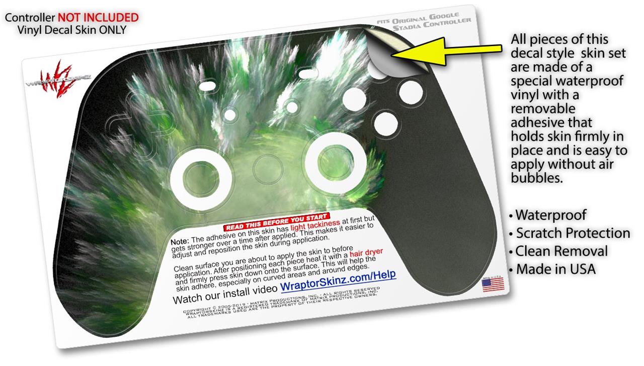 This product is in no way affiliated with or endorsed by Google. WraptorSkinz® skin wraps work with the Original Google Stadia version 1 Controller. Printed using superb photo quality designs and vibrant colors printed with special fade resistant inks that last even in direct sun for years. WraptorSkinz are a composite of two layers of commercial grade materials. The bottom layer is a soft, flexible vinyl with a special removable adhesive that is easily positioned, applied without air bubbles. Next, we print the bottom layer with UV protected, fade resistant inks that deliver superb photo quality designs in vibrant colors. Finally, we bond a professional grade laminate over the entire skin adding a glossy protective finish.
