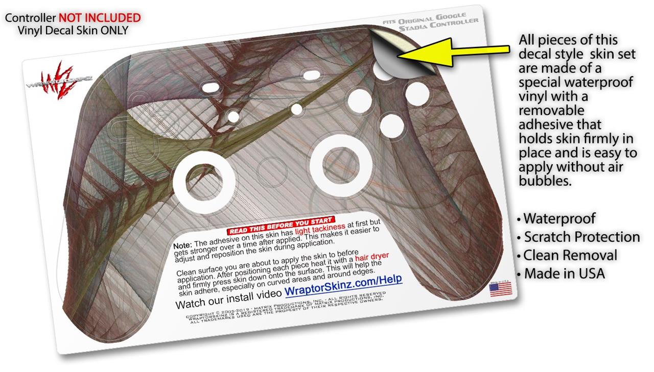 This product is in no way affiliated with or endorsed by Google. WraptorSkinz® skin wraps work with the Original Google Stadia version 1 Controller. Printed using superb photo quality designs and vibrant colors printed with special fade resistant inks that last even in direct sun for years. WraptorSkinz are a composite of two layers of commercial grade materials. The bottom layer is a soft, flexible vinyl with a special removable adhesive that is easily positioned, applied without air bubbles. Next, we print the bottom layer with UV protected, fade resistant inks that deliver superb photo quality designs in vibrant colors. Finally, we bond a professional grade laminate over the entire skin adding a glossy protective finish.
