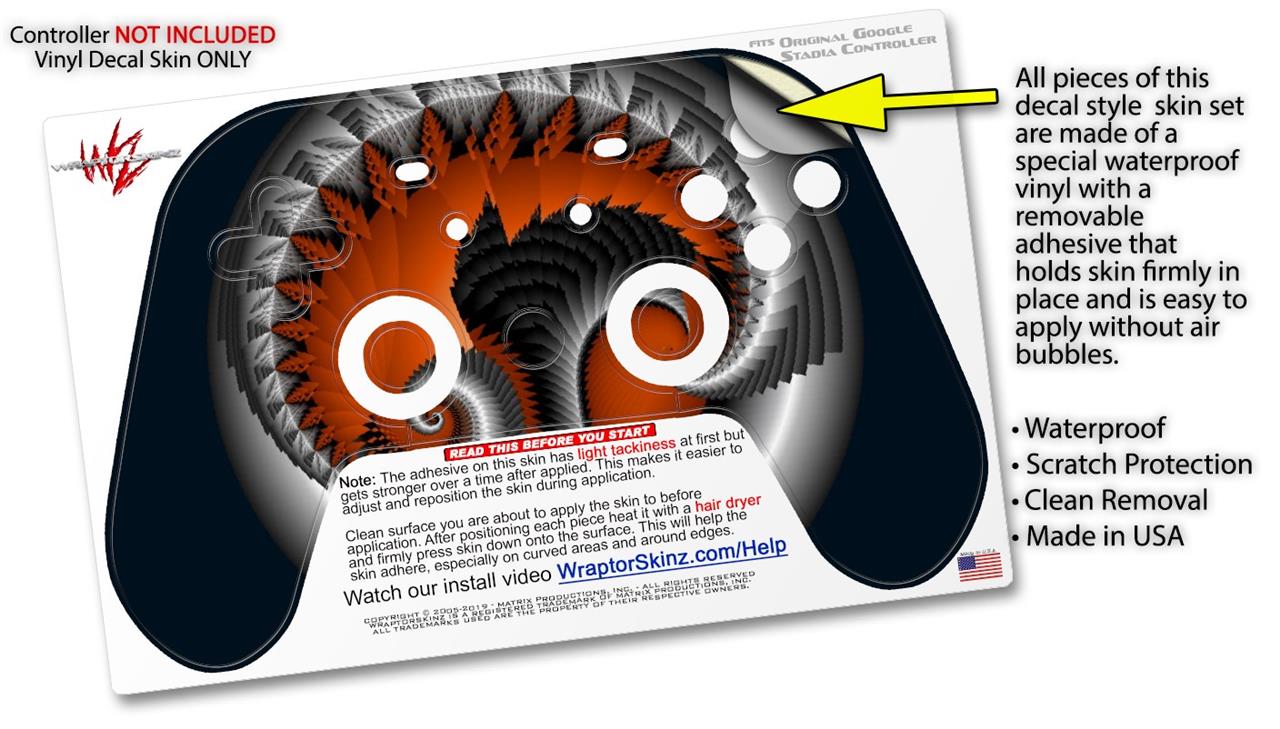 This product is in no way affiliated with or endorsed by Google. WraptorSkinz® skin wraps work with the Original Google Stadia version 1 Controller. Printed using superb photo quality designs and vibrant colors printed with special fade resistant inks that last even in direct sun for years. WraptorSkinz are a composite of two layers of commercial grade materials. The bottom layer is a soft, flexible vinyl with a special removable adhesive that is easily positioned, applied without air bubbles. Next, we print the bottom layer with UV protected, fade resistant inks that deliver superb photo quality designs in vibrant colors. Finally, we bond a professional grade laminate over the entire skin adding a glossy protective finish.