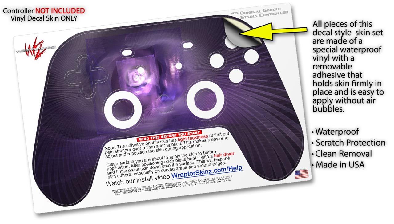 This product is in no way affiliated with or endorsed by Google. WraptorSkinz® skin wraps work with the Original Google Stadia version 1 Controller. Printed using superb photo quality designs and vibrant colors printed with special fade resistant inks that last even in direct sun for years. WraptorSkinz are a composite of two layers of commercial grade materials. The bottom layer is a soft, flexible vinyl with a special removable adhesive that is easily positioned, applied without air bubbles. Next, we print the bottom layer with UV protected, fade resistant inks that deliver superb photo quality designs in vibrant colors. Finally, we bond a professional grade laminate over the entire skin adding a glossy protective finish.