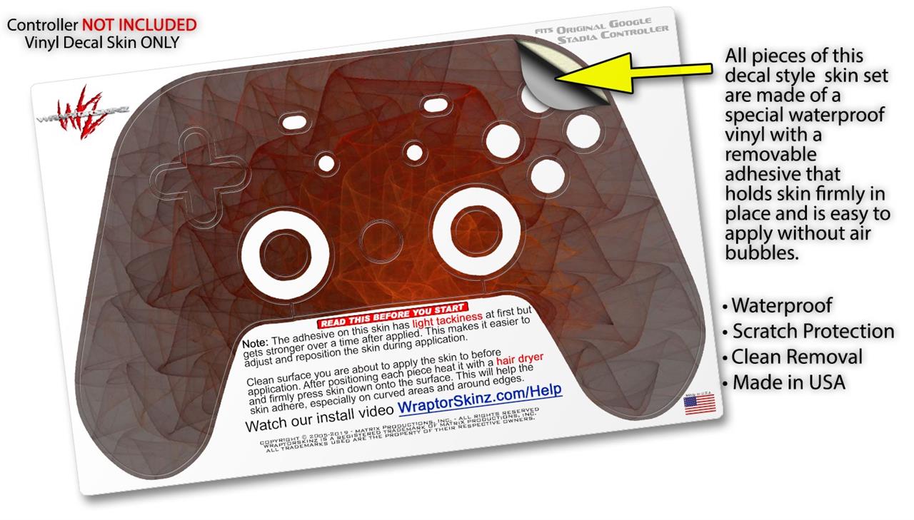 This product is in no way affiliated with or endorsed by Google. WraptorSkinz® skin wraps work with the Original Google Stadia version 1 Controller. Printed using superb photo quality designs and vibrant colors printed with special fade resistant inks that last even in direct sun for years. WraptorSkinz are a composite of two layers of commercial grade materials. The bottom layer is a soft, flexible vinyl with a special removable adhesive that is easily positioned, applied without air bubbles. Next, we print the bottom layer with UV protected, fade resistant inks that deliver superb photo quality designs in vibrant colors. Finally, we bond a professional grade laminate over the entire skin adding a glossy protective finish.