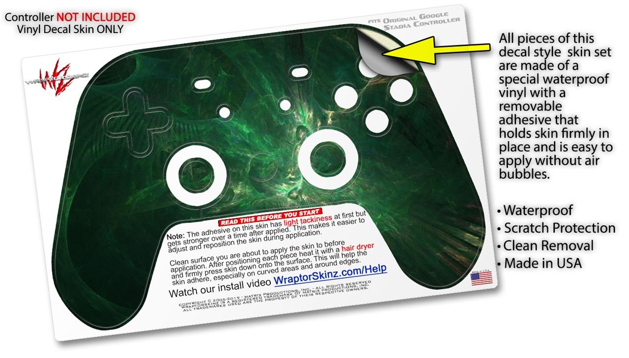 This product is in no way affiliated with or endorsed by Google. WraptorSkinz® skin wraps work with the Original Google Stadia version 1 Controller. Printed using superb photo quality designs and vibrant colors printed with special fade resistant inks that last even in direct sun for years. WraptorSkinz are a composite of two layers of commercial grade materials. The bottom layer is a soft, flexible vinyl with a special removable adhesive that is easily positioned, applied without air bubbles. Next, we print the bottom layer with UV protected, fade resistant inks that deliver superb photo quality designs in vibrant colors. Finally, we bond a professional grade laminate over the entire skin adding a glossy protective finish.