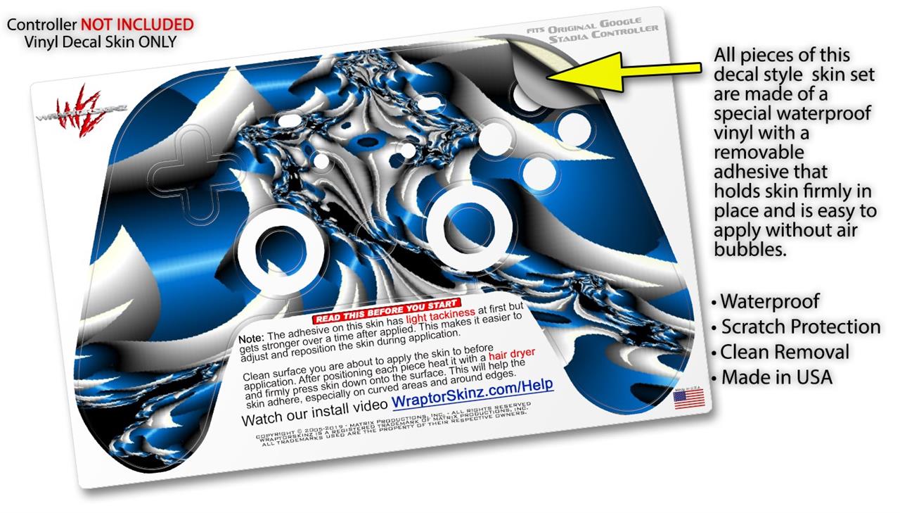 This product is in no way affiliated with or endorsed by Google. WraptorSkinz® skin wraps work with the Original Google Stadia version 1 Controller. Printed using superb photo quality designs and vibrant colors printed with special fade resistant inks that last even in direct sun for years. WraptorSkinz are a composite of two layers of commercial grade materials. The bottom layer is a soft, flexible vinyl with a special removable adhesive that is easily positioned, applied without air bubbles. Next, we print the bottom layer with UV protected, fade resistant inks that deliver superb photo quality designs in vibrant colors. Finally, we bond a professional grade laminate over the entire skin adding a glossy protective finish.