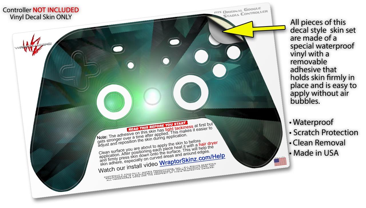 This product is in no way affiliated with or endorsed by Google. WraptorSkinz® skin wraps work with the Original Google Stadia version 1 Controller. Printed using superb photo quality designs and vibrant colors printed with special fade resistant inks that last even in direct sun for years. WraptorSkinz are a composite of two layers of commercial grade materials. The bottom layer is a soft, flexible vinyl with a special removable adhesive that is easily positioned, applied without air bubbles. Next, we print the bottom layer with UV protected, fade resistant inks that deliver superb photo quality designs in vibrant colors. Finally, we bond a professional grade laminate over the entire skin adding a glossy protective finish.