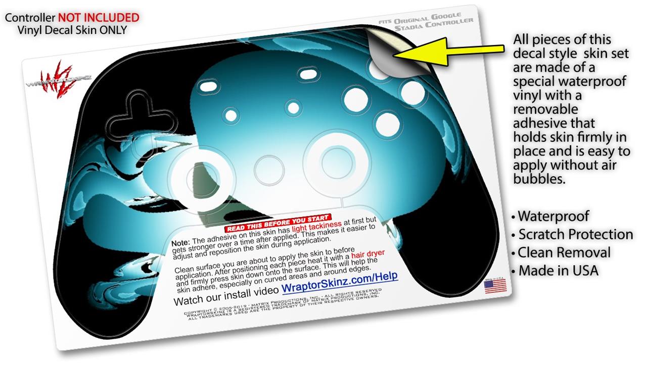 This product is in no way affiliated with or endorsed by Google. WraptorSkinz® skin wraps work with the Original Google Stadia version 1 Controller. Printed using superb photo quality designs and vibrant colors printed with special fade resistant inks that last even in direct sun for years. WraptorSkinz are a composite of two layers of commercial grade materials. The bottom layer is a soft, flexible vinyl with a special removable adhesive that is easily positioned, applied without air bubbles. Next, we print the bottom layer with UV protected, fade resistant inks that deliver superb photo quality designs in vibrant colors. Finally, we bond a professional grade laminate over the entire skin adding a glossy protective finish.