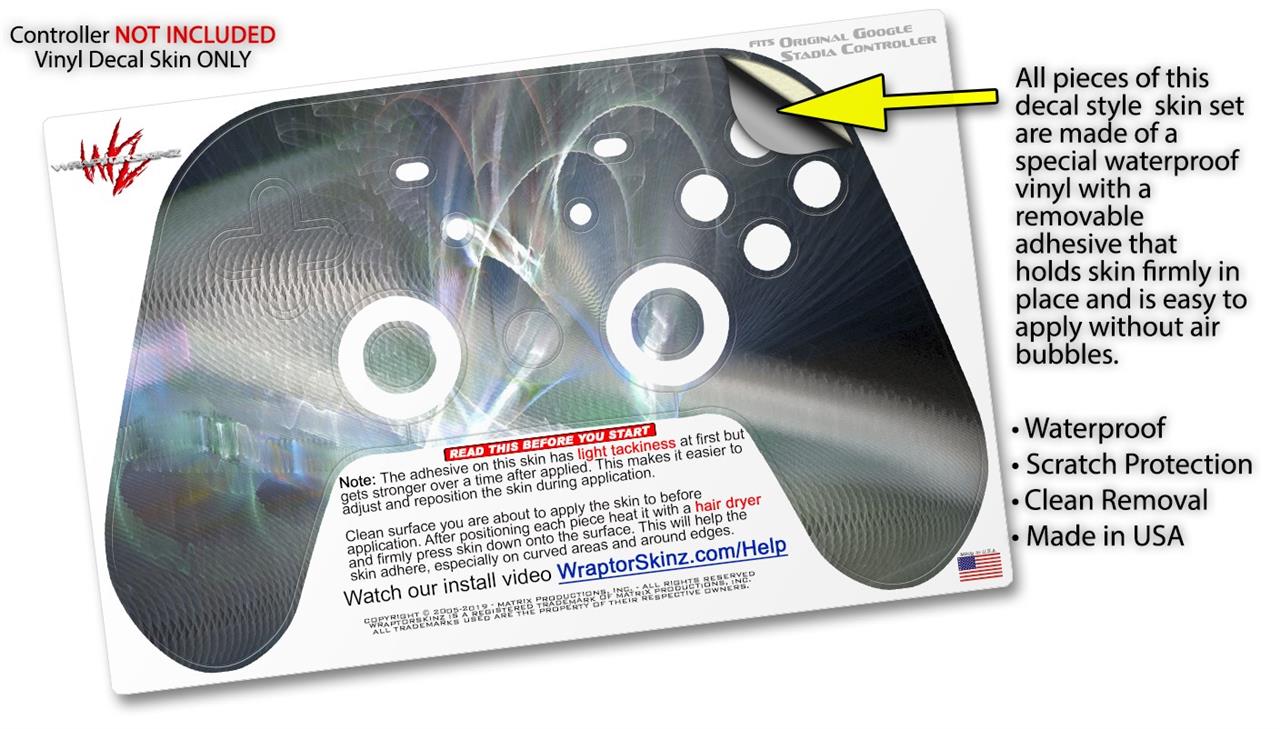 This product is in no way affiliated with or endorsed by Google. WraptorSkinz® skin wraps work with the Original Google Stadia version 1 Controller. Printed using superb photo quality designs and vibrant colors printed with special fade resistant inks that last even in direct sun for years. WraptorSkinz are a composite of two layers of commercial grade materials. The bottom layer is a soft, flexible vinyl with a special removable adhesive that is easily positioned, applied without air bubbles. Next, we print the bottom layer with UV protected, fade resistant inks that deliver superb photo quality designs in vibrant colors. Finally, we bond a professional grade laminate over the entire skin adding a glossy protective finish.