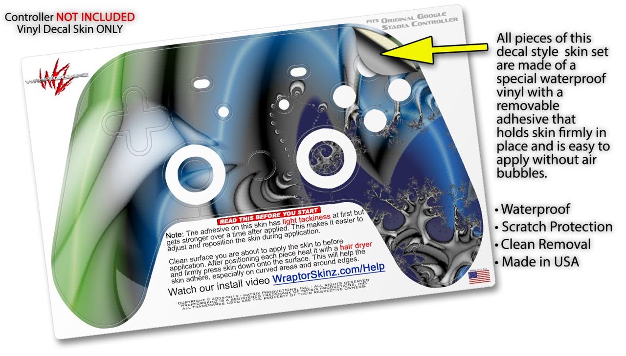 This product is in no way affiliated with or endorsed by Google. WraptorSkinz® skin wraps work with the Original Google Stadia version 1 Controller. Printed using superb photo quality designs and vibrant colors printed with special fade resistant inks that last even in direct sun for years. WraptorSkinz are a composite of two layers of commercial grade materials. The bottom layer is a soft, flexible vinyl with a special removable adhesive that is easily positioned, applied without air bubbles. Next, we print the bottom layer with UV protected, fade resistant inks that deliver superb photo quality designs in vibrant colors. Finally, we bond a professional grade laminate over the entire skin adding a glossy protective finish.