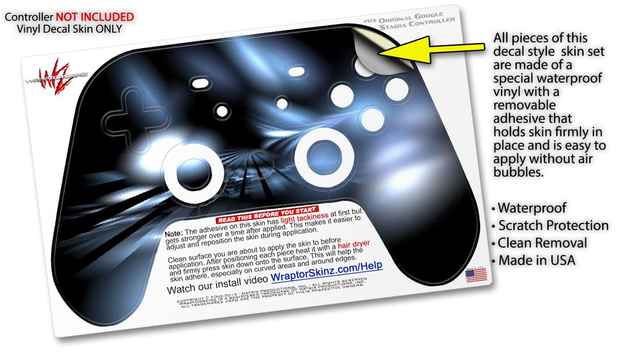This product is in no way affiliated with or endorsed by Google. WraptorSkinz® skin wraps work with the Original Google Stadia version 1 Controller. Printed using superb photo quality designs and vibrant colors printed with special fade resistant inks that last even in direct sun for years. WraptorSkinz are a composite of two layers of commercial grade materials. The bottom layer is a soft, flexible vinyl with a special removable adhesive that is easily positioned, applied without air bubbles. Next, we print the bottom layer with UV protected, fade resistant inks that deliver superb photo quality designs in vibrant colors. Finally, we bond a professional grade laminate over the entire skin adding a glossy protective finish.