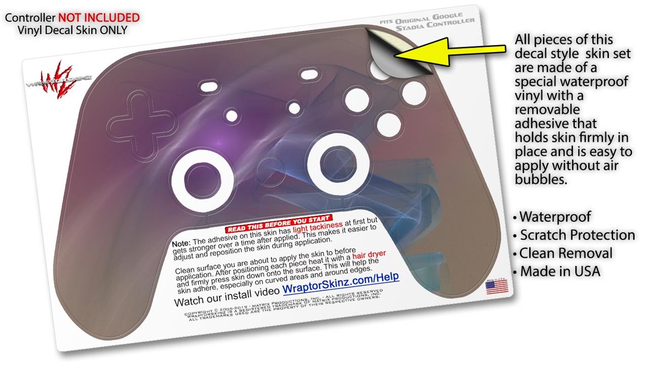 This product is in no way affiliated with or endorsed by Google. WraptorSkinz® skin wraps work with the Original Google Stadia version 1 Controller. Printed using superb photo quality designs and vibrant colors printed with special fade resistant inks that last even in direct sun for years. WraptorSkinz are a composite of two layers of commercial grade materials. The bottom layer is a soft, flexible vinyl with a special removable adhesive that is easily positioned, applied without air bubbles. Next, we print the bottom layer with UV protected, fade resistant inks that deliver superb photo quality designs in vibrant colors. Finally, we bond a professional grade laminate over the entire skin adding a glossy protective finish.