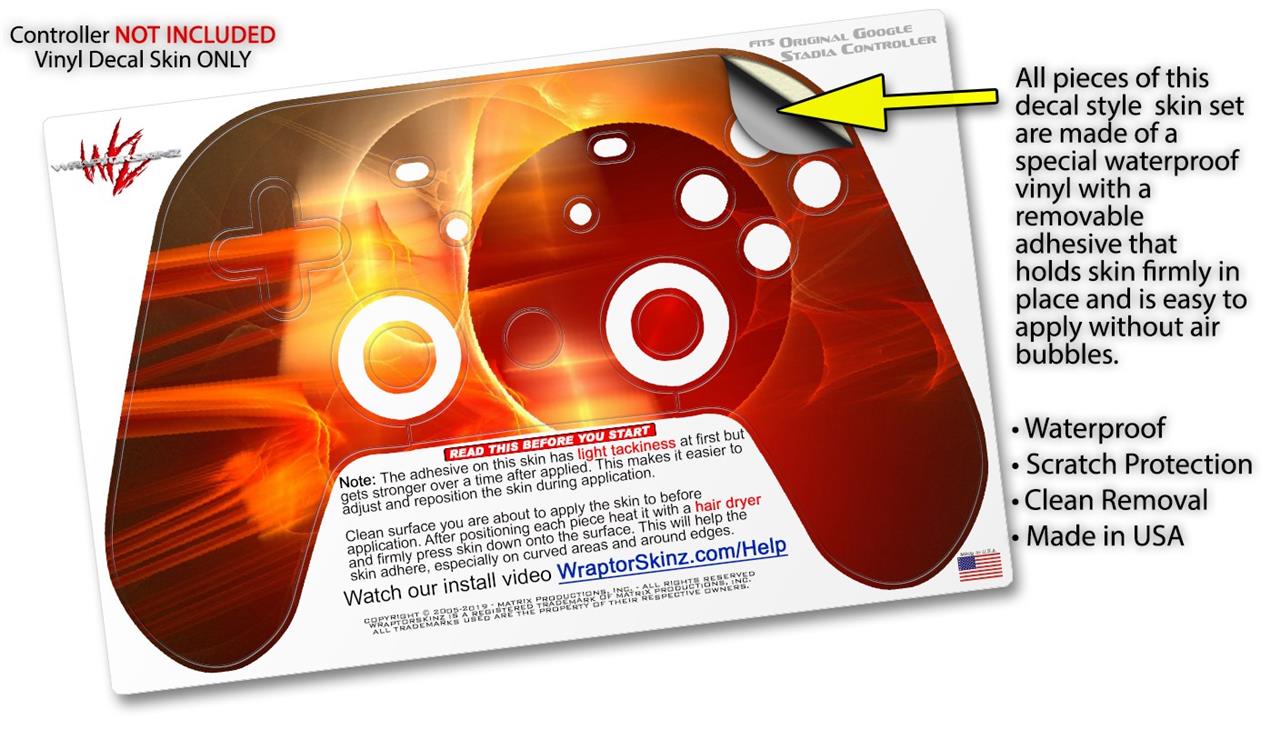 This product is in no way affiliated with or endorsed by Google. WraptorSkinz® skin wraps work with the Original Google Stadia version 1 Controller. Printed using superb photo quality designs and vibrant colors printed with special fade resistant inks that last even in direct sun for years. WraptorSkinz are a composite of two layers of commercial grade materials. The bottom layer is a soft, flexible vinyl with a special removable adhesive that is easily positioned, applied without air bubbles. Next, we print the bottom layer with UV protected, fade resistant inks that deliver superb photo quality designs in vibrant colors. Finally, we bond a professional grade laminate over the entire skin adding a glossy protective finish.
