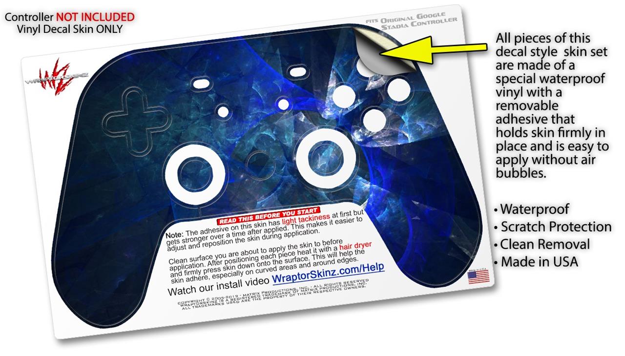 This product is in no way affiliated with or endorsed by Google. WraptorSkinz® skin wraps work with the Original Google Stadia version 1 Controller. Printed using superb photo quality designs and vibrant colors printed with special fade resistant inks that last even in direct sun for years. WraptorSkinz are a composite of two layers of commercial grade materials. The bottom layer is a soft, flexible vinyl with a special removable adhesive that is easily positioned, applied without air bubbles. Next, we print the bottom layer with UV protected, fade resistant inks that deliver superb photo quality designs in vibrant colors. Finally, we bond a professional grade laminate over the entire skin adding a glossy protective finish.