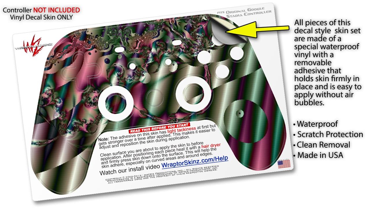 This product is in no way affiliated with or endorsed by Google. WraptorSkinz® skin wraps work with the Original Google Stadia version 1 Controller. Printed using superb photo quality designs and vibrant colors printed with special fade resistant inks that last even in direct sun for years. WraptorSkinz are a composite of two layers of commercial grade materials. The bottom layer is a soft, flexible vinyl with a special removable adhesive that is easily positioned, applied without air bubbles. Next, we print the bottom layer with UV protected, fade resistant inks that deliver superb photo quality designs in vibrant colors. Finally, we bond a professional grade laminate over the entire skin adding a glossy protective finish.