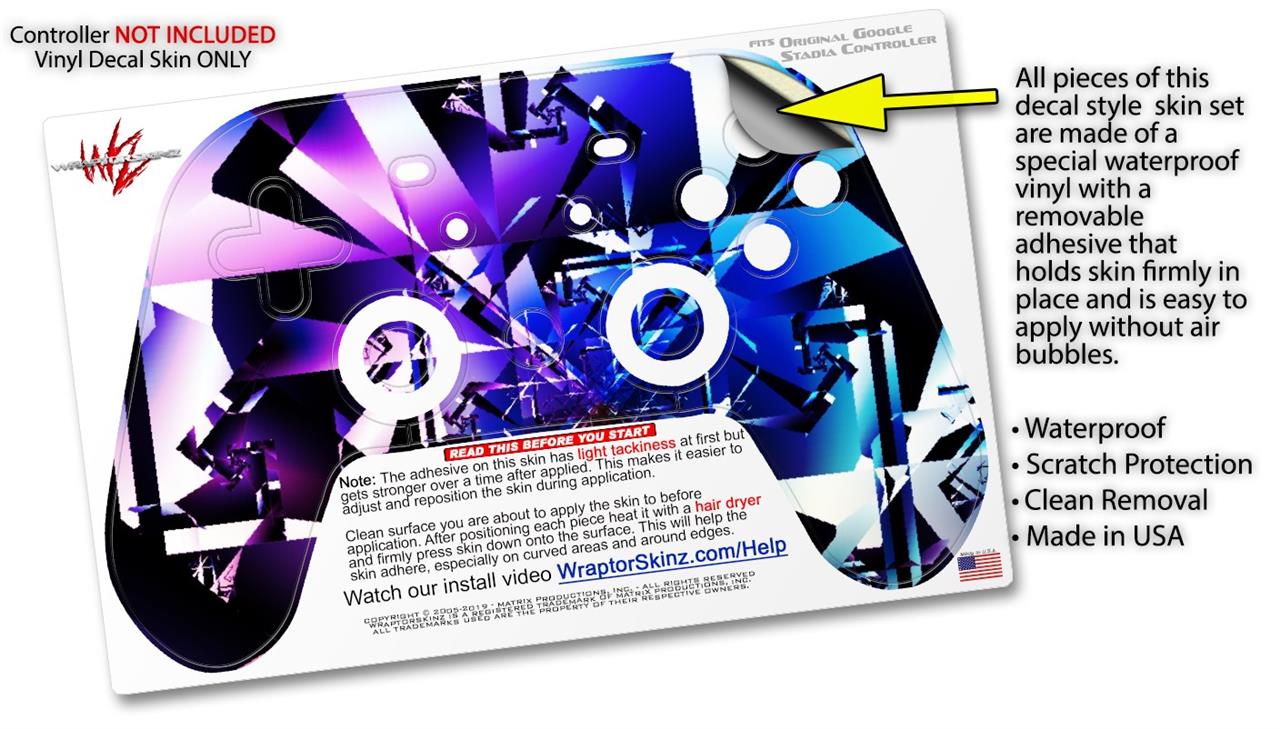 This product is in no way affiliated with or endorsed by Google. WraptorSkinz® skin wraps work with the Original Google Stadia version 1 Controller. Printed using superb photo quality designs and vibrant colors printed with special fade resistant inks that last even in direct sun for years. WraptorSkinz are a composite of two layers of commercial grade materials. The bottom layer is a soft, flexible vinyl with a special removable adhesive that is easily positioned, applied without air bubbles. Next, we print the bottom layer with UV protected, fade resistant inks that deliver superb photo quality designs in vibrant colors. Finally, we bond a professional grade laminate over the entire skin adding a glossy protective finish.